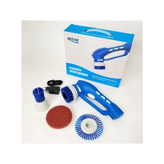 Enkel å bruke, oppladbar liten skrubber som også er vanntett og slitesterk med ergonomisk design, perfekt for rengjøring på kjøkken og bad. Denne håndholdte maskinen rekker inn i hjørner, kommer rundt kraner, rør etc. og er kraftig nok til å rengjøre større flater som badekar og arbeidsbenker. Activa Handy Scrubber leveres med 3 forskjellige børster, en skurepad, batteri og lader. - Hastighet: 180-220 RPM - Oppladbart batteri: Li-ion 3,6V 2600mAh - Driftstid: 80 minutter med fulladet batteri