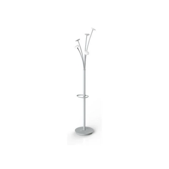 Elegante frakkstativ i sølvgrått, bestående av 5 avrundede frakk-kroker, en paraplyholder og en vektet base med vannbeholder. Innovativt og designet konsept En designinnovasjon til lav pris: Alba-konseptet! Store, omformet frakk-kroker for perfekt pleie av klærne Smart paraplyholder (6) og vannbeholder for å fange dråper Vektet base for ekstra stabilitet (5 kg) Rask og enkel montering uten verktøy Kompakt emballasje for en større reduksjon av CO2-utslipp