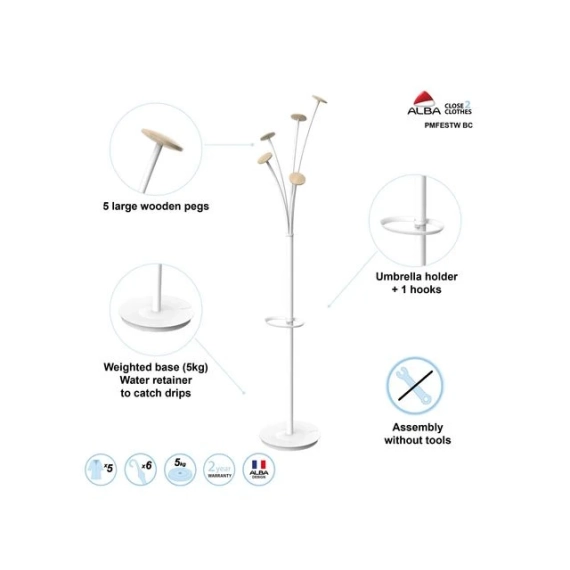 Alba Klesstativ 5 kroker 187cm hvit/tre