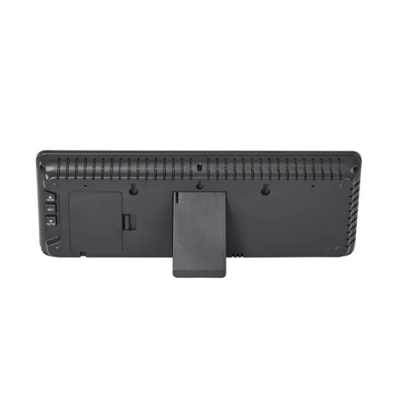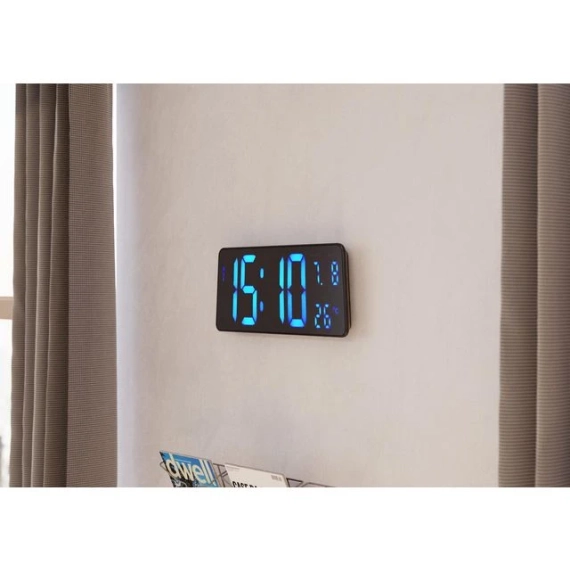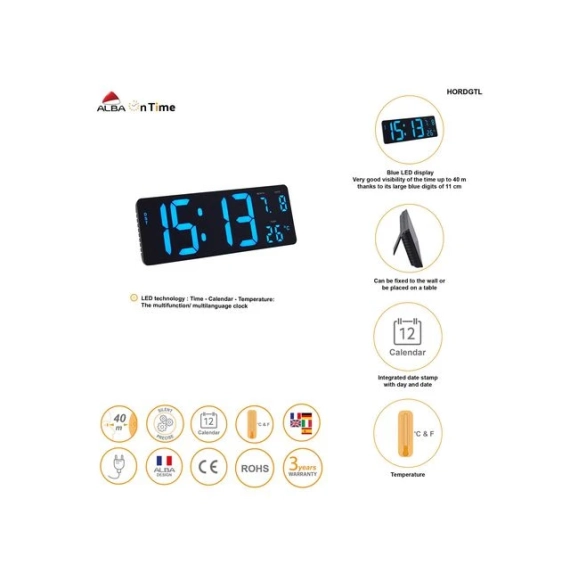 Moderne designet digital klokke perfekt for ulike arbeidsmiljøer Med sitt moderne design passer denne digitale klokken perfekt inn i ulike arbeidsmiljøer. Med sin rektangulære form gir de store blå LED-sifrene deg perfekt synlighet for tid, temperatur og viser også datoen. - Blå LCD-teknologi - En allsidig LCD-klokke: - Kalenderfunksjon: visning av tid: dag og måned - Temperaturfunksjon (celsius / fahrenheit) - God klarhet på tiden (11 cm høy - Presis LED-bevegelse - Kan festes på veggen eller plasseres på bordet takket være de 2 medfølgende krokene - Adapter medfølger + LR6-batteri for minnet er ikke inkludert
