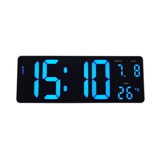 Moderne designet digital klokke perfekt for ulike arbeidsmiljøer Med sitt moderne design passer denne digitale klokken perfekt inn i ulike arbeidsmiljøer. Med sin rektangulære form gir de store blå LED-sifrene deg perfekt synlighet for tid, temperatur og viser også datoen. - Blå LCD-teknologi - En allsidig LCD-klokke: - Kalenderfunksjon: visning av tid: dag og måned - Temperaturfunksjon (celsius / fahrenheit) - God klarhet på tiden (11 cm høy - Presis LED-bevegelse - Kan festes på veggen eller plasseres på bordet takket være de 2 medfølgende krokene - Adapter medfølger + LR6-batteri for minnet er ikke inkludert