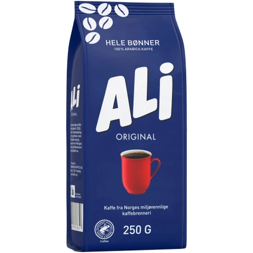ALI Kaffe original har en perfekt balanse mellom god fylde, fin aroma og lett syrlighet som gir den gode smaken som kjennetegner ALI Kaffe. ALI Kaffe original består av 100% Arabica-bønner fra Brasil og Colombia som dyrkes på 1.000 – 1.600 meters høyde, hvor det er perfekt jordsmonn og klima for kaffedyrking. Ved å kombinere kaffebønner fra de to landene får en fram en perfekt balanse mellom god fylde, fin aroma og lett syrlighet som gir den gode smaken som kjennetegner ALI Kaffe. - Malingsgrad: Hele bønner. - Volum: 250g.