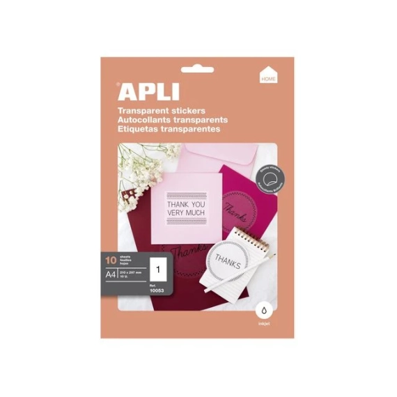 Transparente etiketter med firkantede hjørner. Gjennomsiktige blanke etiketter, nesten usynlige, ideelle hvis du trenger å bruke en etikett på fargede konvolutter eller for å merke eller signalisere uten å skjule overflaten du fester deg til. Utmerket kvalitet ved bruk av blekkskrivere. Last ned gratis programvare for å designe og skrive ut alle slags etiketter: www.apli.com - Størrelse 210,0x297,0mm Permanent lim - Pakke med 10 ark (10 etiketter) - Ideelle hvis du trenger å bruke en etikett på fargede konvolutter eller for å merke eller signalisere uten å skjule overflaten du fester deg til - Last ned gratis programvare for å designe og skrive ut alle slags etiketter: www.apli.com