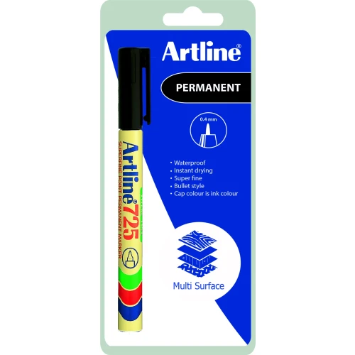 Permanent merkepenn med 0.4 mm rund spiss. Hurtigtørkende, vannfast, aluminiumskropp, påfyllbar, hette med clips, alkoholbasert permanent tusj uten Xylen. Farge: Sort.