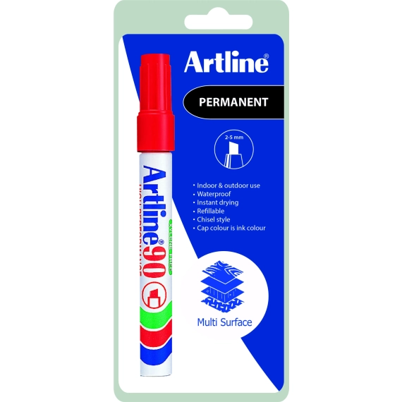 Artline 90 er en permanent merkepenn med skrå spiss og en ekstra sterk aluminiums hylse. Tilgjengelig i åtte farger med en strekbredde på 2,0 -5 mm. Artline 90-merkepenner inneholder et trygt Xylene-fri, alkohol-løsningsmiddelbasert blekk. Dette er hurtigtørkende og vannavstøtende. Egnet for bruk på de fleste overflater, inkludert papir, papp, plast, metall og glass.
