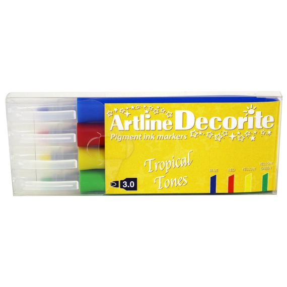Passer til bruk på de fleste overflater. Ideell for dekorering, fargelegging og layering. Perfekt på mørk farget papp og papir, tre, keramikk, porselen, metall, plast, tavler og mye mer. Tilgjengelig i tre spiss typer - kul, meisel og børste og et sortiment på 20 farger, bestående av standard, pastell og metallic nyanser. Med vannbasert pigment blekk er Artline Decorite-merkepennene klare til å bruke umiddelbart uten å måtte pumpe eller riste! Lett å vaske av på ikke-porøse overflater med vann.