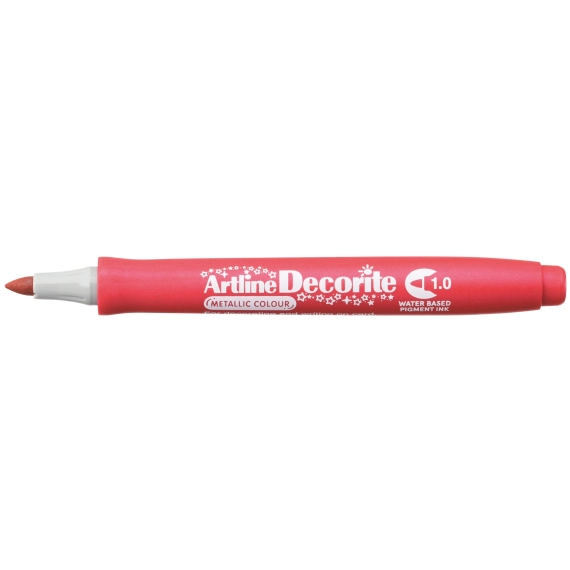 Artline Decorite Suitable for use on most surfaces. Ideal for decorating, colouring and layering. Perfect on dark coloured card and paper, wood, ceramic, porcelain, metal, plastic, chalkboards and many more. Available in three nib types - bullet, chisel and brush and a range of 20 colours, comprised of standard, pastel and metallic shades. With a waterbased pigment ink, the Artline Decorite markers are ready to use instantly with no need to pump or shake! Easily erased on non-porus surfaces with water.