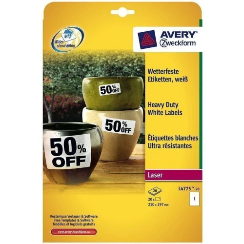 Ekstra holdbare og permanent klebende etiketter - perfekte til utendørsbruk. Etikettene er spesielt velegnet til bruk i omgivelser som stiller høye krav til holdbarheten siden de er fremstilt av slitesterkt polyestermateriale. De er motstandsdyktige overfor olje, smuss, vann og UV-stråler. Tåler temperaturer fra -20 til +80 °C. Etikettene er velegnet til merking av pc-utstyr, inventar, verktøy og produkter. Etikettene er velegnet til laserprint. Design og print etikettene med GRATIS Avery online software, som du finner på www.avery.dk. Etikettformat: 210 x 297 mm. Pakke á 20 ark x 1 etikett/ark = 20 etiketter/pk.