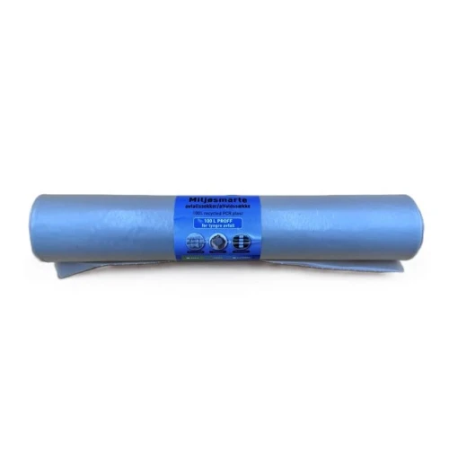Denne firkantsekken er produsert av 100% PCR plast. - Tykkelse: 65my - Størrelse: 70 x 110cm - Farge: transparent - Kapasitet: ca. 100 liter