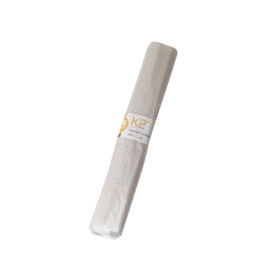 Transparent knytesekk i K2-serien. Laget av 100% resirkulert materiale. Tykkelse: 35my. - Mål: 750x1250mm - Farge: Klar - Kapasitet: 125l - 10 poser per rull