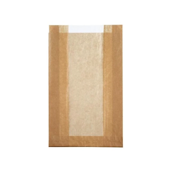 Brun papirpose med vindu, til bakervarer og lignende. Posen, inkludert vinduet, er laget av 100% papir og gjenvinnes som papiravfall. - Papirposens mål (LxBxH): 210x80x340mm. - Maksvekt: 3kg. - Farge: Brun. - Bruksområde: Tørre og fete matvarer. - Øvre brukstemperatur: 60 grader.