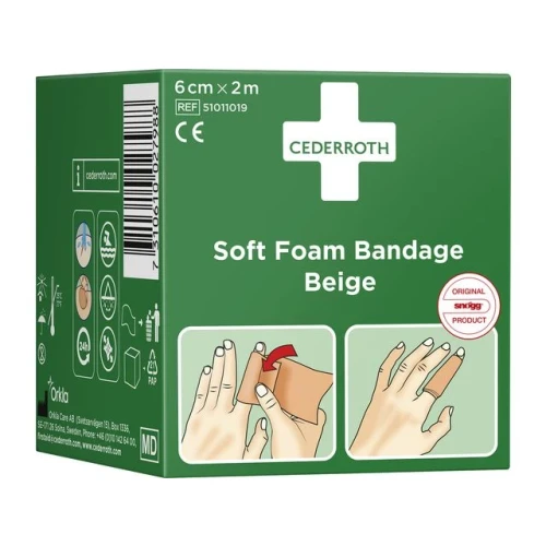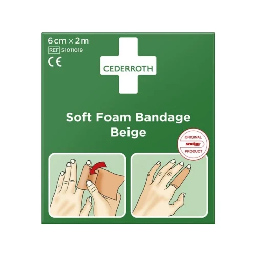 Cederroth Soft Foam Bandage Beige 2 m fungerer både som plaster og som bandasje, og egner seg for mindre sår. Cederroth Soft Foam Bandage er et selvheftende limfritt plaster og kleber seg derfor ikke fast i hud eller hår. Riv ganske enkelt av en passende bit og vikle rundt det skadde området. Ved kraftig blødning kan man forme en bit Soft Foam Bandage som en ?pute? for å lage en trykkbandasje. - Selvheftende plaster - Limfritt og kleber seg derfor ikke fast i hud eller hår - Ideell for rask og enkel sårpleie - Bandasjen passer på alle typer små sår, uavhengig av varme, kulde ? vått eller tørt, og den blir sittende også i vann - Passer i Cederroth First Aid Station - Lateksfri.
