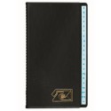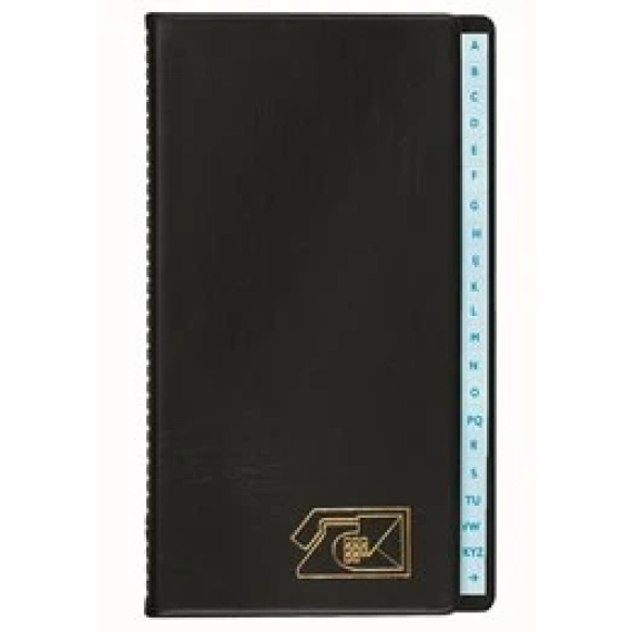 Utstyrt med alfabetregister, ekstra løsark og selvklebende rettelsesetiketter. Forsiden av omslaget er smalere enn registeret, slik at alfabetfaner er synlige når permen er lukket. Utstyrt med 24-delt alfabetregister A-Å. Blått trykk med firelinjers adressefelt. Bakerst utstyrt med tre ekstra løsark og 14 rettelsesetiketter. Pakket med tolv stk. i display.