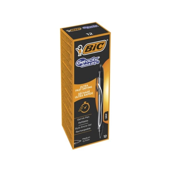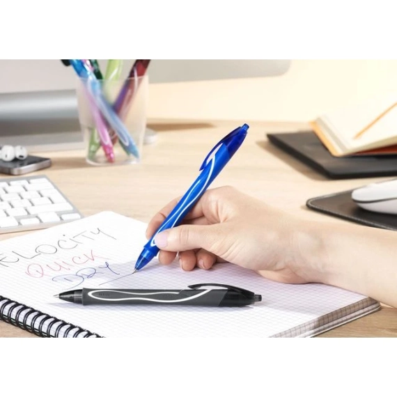 Skriv daglige notater enkelt og komfortabelt med Bics inntrekkbare GELOCITY-kulepenn, som har en middels tykk spiss på 0,7 mm og er hurtigtørkende. Det er enkelt å ta notater og illustrere fine linjer jevnt, takket være denne inntrekkbare pennen som også kommer i assorterte farger. Lommeklipsen som er festet til selve pennen, gjør den bærbar slik at den alltid er tilgjengelig når enn og hvor enn du skulle trenge den. Den inntrekkbare GELOCITY-kulepennen fra Bic er polstret med et komfortabelt gummigrep, noe som gjør den enda mer behagelig å bruke, uansett hvor lenge du trenger den. - Gummigrepet gir en komfortabel polstring - Inntrekkbar - Hurtigtørkende mekanisme - Jevnt gelblekk for enkel skriving - Lommeklips som gjør den bærbar - Strekbredde: 0,3 mm - Spisstørrelse: Middels 0,7 mm - Spissmateriale: Metall - Farge: Sort -