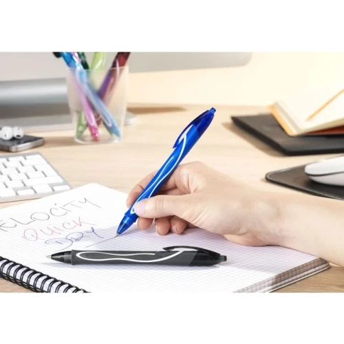 Skriv daglige notater enkelt og komfortabelt med Bics inntrekkbare GELOCITY-kulepenn, som har en middels tykk spiss på 0,7 mm og er hurtigtørkende. Det er enkelt å ta notater og illustrere fine linjer jevnt, takket være denne inntrekkbare pennen som også kommer i assorterte farger. Lommeklipsen som er festet til selve pennen, gjør den bærbar slik at den alltid er tilgjengelig når enn og hvor enn du skulle trenge den. Den inntrekkbare GELOCITY-kulepennen fra Bic er polstret med et komfortabelt gummigrep, noe som gjør den enda mer behagelig å bruke, uansett hvor lenge du trenger den. - Gummigrepet gir en komfortabel polstring - Inntrekkbar - Hurtigtørkende mekanisme - Jevnt gelblekk for enkel skriving - Lommeklips som gjør den bærbar - Strekbredde: 0,3 mm - Spisstørrelse: Middels 0,7 mm - Spissmateriale: Metall - Farge: Sort -