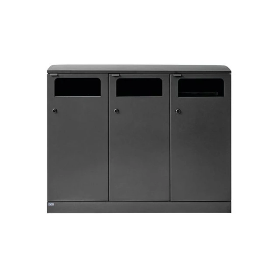 Elegant avfallssystem med 3 inndelinger i stilig og praktisk design. Dette er et fleksibelt avfallssystem fra Bica som sørger for enkel og brukervennlig avfallssortering utendørs. Avfallssystemet er utformet med 3 fraksjoner med sideinngang for enkel avfallssortering. Det er mulig å installere en metallklaff slik at fugler ikke kommer inn i avfallet. Avfallssystemet kommer med integrerte poseholdere, som kan trekkes ut når posen skal skiftes. Avfallssystemet har også inngangsdører for enkel tømming som kan åpnes med nøkkel. Denne Bica-modellen kan kombineres med andre Bica-modeller i samme dybde. FUNKSJONER: Avfallssystemet er utstyrt med inngangsdører for ergonomisk riktig tømming uten tunge løft. Avfallssystemet er utstyrt med en integrert og sterk poseholder, slik at posen holder seg på plass. Den lukkede toppen skjuler også posen, slik at avfallssystemet opprettholder et stilig design. Den kan festes fast i underlaget, slik at den ikke kan flyttes og samtidig låses. DESIGN: For å oppnå lang levetid og minimalt vedlikehold er avfallsbeholderen laget av rustfritt stål. Det stilige designet og de rene linjene gjør den til en avfallsbeholder som naturlig kan integreres i de fleste utemiljøer. Utendørs bruk Farge: Antrasitt Størrelse (H x B x D): 95x120x40 cm Minimum posestr: 82x105 cm