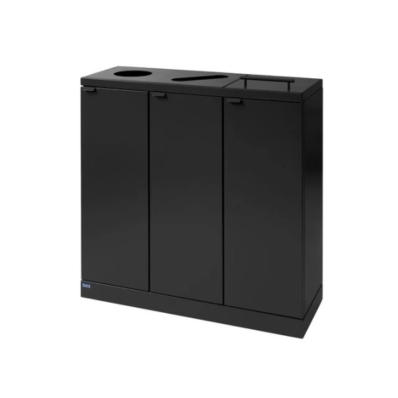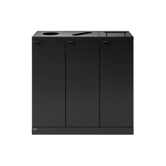 Elegant avfallssystem med 3 inndelinger i stilig design. Dette er et fleksibelt avfallssystem fra Bica som sørger for enkel og brukervennlig avfallssortering på arbeidsplassen. Avfallssystemet er utformet med 3 fraksjoner, henholdsvis 2 åpne deponier og 1 med lokk og håndtak. Hensikten med lokket er å minimere luktplager og hindre bananfluer ved sortering av matavfall. En virkelig smart løsning hvis posen ikke tømmes veldig ofte. Den ene runde innsatsen passer til flasker/bokser og den andre er avlang for sortering av papir. FUNKSJONER Avfallssystemet er utstyrt med frontdører med soft close for ergonomisk riktig tømming uten tunge løft. Avfallssystemet er utstyrt med integrerte og sterke poseholdere, slik at posen holder seg på plass. Lokket skjuler også posene, slik at avfallssystemet holder et stilig design. Avfallssystemet er mobilt takket være de monterte hjulene, som er skjult bak sokkelen. DESIGN Alle modellene i Bica Series S30 kan tilpasses og kombineres etter behov ved hjelp av kraftige magneter. For å oppnå høy hygiene og minimalt vedlikehold er avfallssystemet laget av pulverlakkert stål. Det stilige designet og de rene linjene gjør det til en avfallsbeholder som naturlig kan integreres i interiøret. Innendørs bruk Serie: S30 Farge: Antrasitt Størrelse (H x B x D): 84,5x87x30 cm Minimum posestr: 60x90 cm