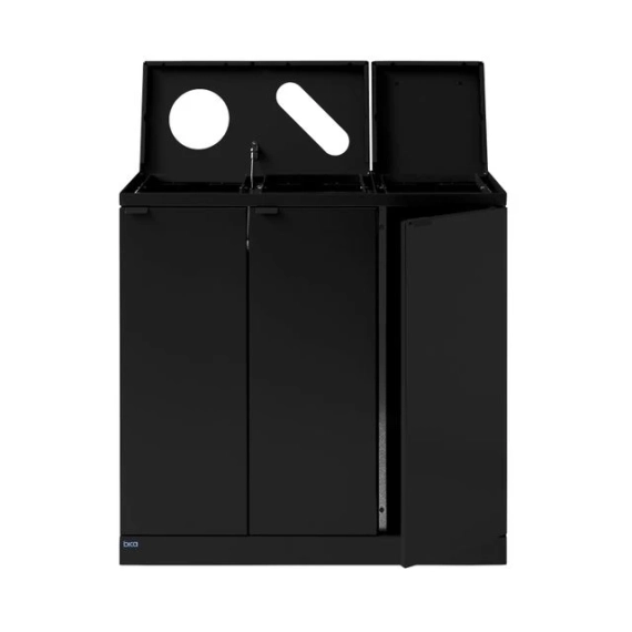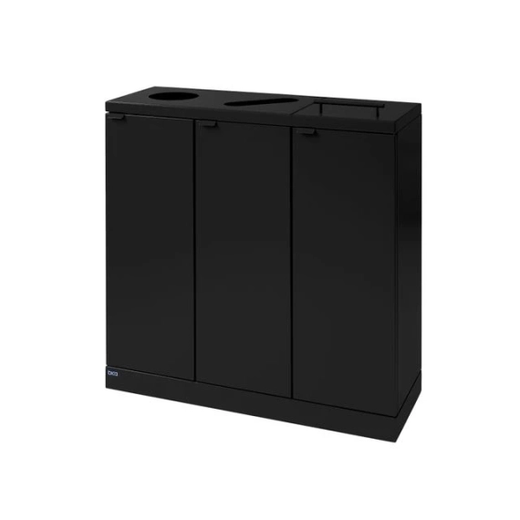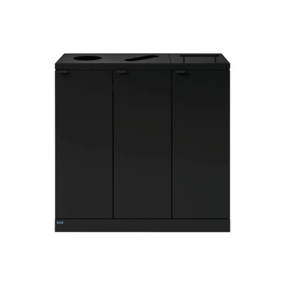 Elegant avfallssystem med 3 inndelinger i stilig design. Dette er et fleksibelt avfallssystem fra Bica som sørger for enkel og brukervennlig avfallssortering på arbeidsplassen. Avfallssystemet er utformet med 3 fraksjoner, henholdsvis 2 åpne deponier og 1 med lokk og håndtak. Hensikten med lokket er å minimere luktplager og hindre bananfluer ved sortering av matavfall. En virkelig smart løsning hvis posen ikke tømmes veldig ofte. Den ene runde innsatsen passer til flasker/bokser og den andre er avlang for sortering av papir. FUNKSJONER Avfallssystemet er utstyrt med frontdører med soft close for ergonomisk riktig tømming uten tunge løft. Avfallssystemet er utstyrt med integrerte og sterke poseholdere, slik at posen holder seg på plass. Lokket skjuler også posene, slik at avfallssystemet holder et stilig design. Avfallssystemet er mobilt takket være de monterte hjulene, som er skjult bak sokkelen. DESIGN Alle modellene i Bica Series S30 kan tilpasses og kombineres etter behov ved hjelp av kraftige magneter. For å oppnå høy hygiene og minimalt vedlikehold er avfallssystemet laget av pulverlakkert stål. Det stilige designet og de rene linjene gjør det til en avfallsbeholder som naturlig kan integreres i interiøret. Innendørs bruk Serie: S30 Farge: Sort Størrelse (H x B x D): 84,5x87x30 cm Minimum posestr: 60x90 cm