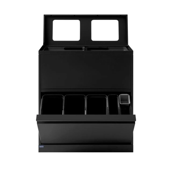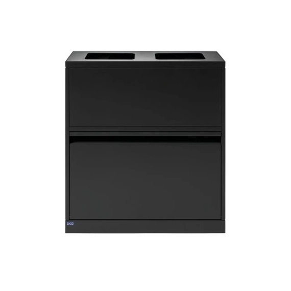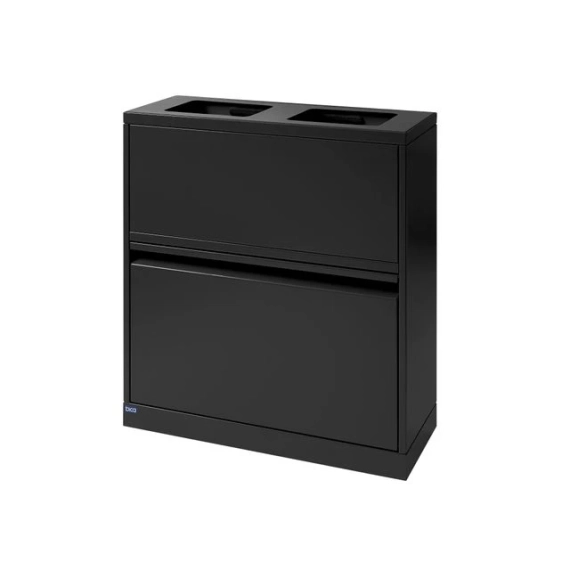 Elegant avfallssystem som kan deles i opptil 11 inndelinger i stilig og praktisk design. Dette er et fleksibelt avfallssystem fra Bica som sørger for enkel og brukervennlig avfallssortering på arbeidsplassen. Avfallssystemet er utformet med 2 åpne inntak på toppen med 20 liters innerbeholdere og med en skuff under for innerbeholdere (2x15L og 1x10L følger med). Nedre del av avfallssystemet kan tilpasses etter behov, slik at totalt 11 enheter kan sorteres. Bica Model 880 er absolutt en av leverandørens mest populære modeller. FUNKSJONER Avfallssystemet er utstyrt med skuff med soft close for lydløs og stille lukking. Avfallssystemet leveres med innerbeholdere med håndtak for enkel håndtering ved tømming. Lokket skjuler de indre beholderne og posene, slik at avfallssystemet opprettholder et stilig design. Avfallssystemet er mobilt takket være de monterte hjulene, som er skjult bak sokkelen. DESIGN For å oppnå høy hygiene og minimalt vedlikehold er avfallssystemet laget av pulverlakkert stål. Det stilige designet og de rene linjene gjør det til en avfallsbeholder som naturlig kan integreres i interiøret. Innendørs bruk Farge: Antrasitt Størrelse (H x B x D): 84,5x78x30 cm Minimum posestr: 45x31/ 52x31/ 62x31 cm