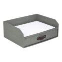 Praktisk og stilren brevkurv med skuff under. Perfekt for å holde orden på dokumenter og småsaker du trenger på kontorplassen. Med smidig lærhåndtak for stilrent uttrykk. - Med gummiføtter som beskytter underlaget og øker stabiliteten - Laget av returpapp og kledd med papirlaminat - Mål (BxDxH): 33x25,5x13cm