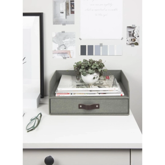 Praktisk og stilren brevkurv med skuff under. Perfekt for å holde orden på dokumenter og småsaker du trenger på kontorplassen. Med smidig lærhåndtak for stilrent uttrykk. - Med gummiføtter som beskytter underlaget og øker stabiliteten - Laget av returpapp og kledd med papirlaminat - Mål (BxDxH): 33x25,5x13cm