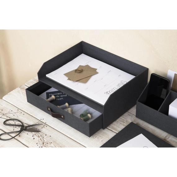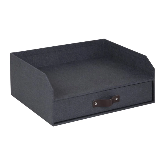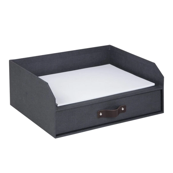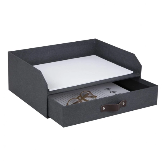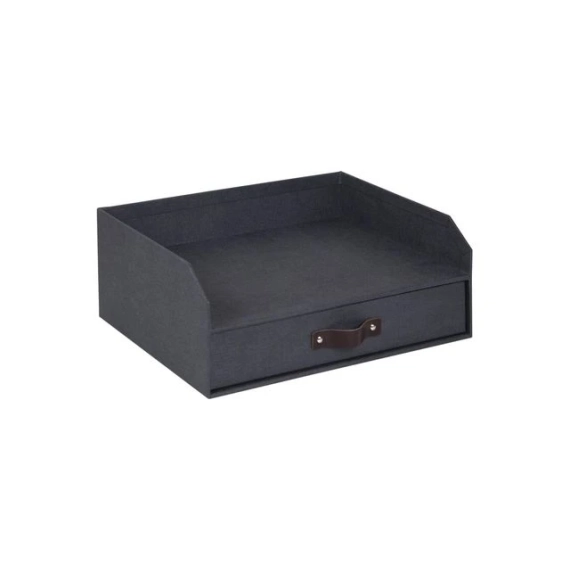 Praktisk og stilren brevkurv med skuff under. Perfekt for å holde orden på dokumenter og småsaker du trenger på kontorplassen. Med smidig lærhåndtak for stilrent uttrykk. - Med gummiføtter som beskytter underlaget og øker stabiliteten - Laget av returpapp og kledd med papirlaminat - Mål (BxDxH): 33x25,5x13cm
