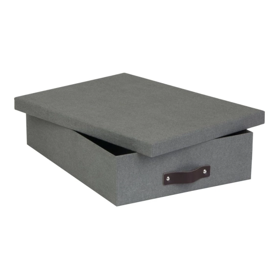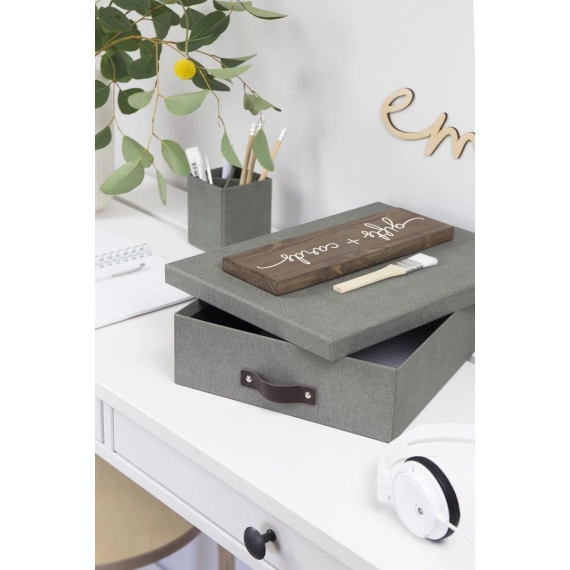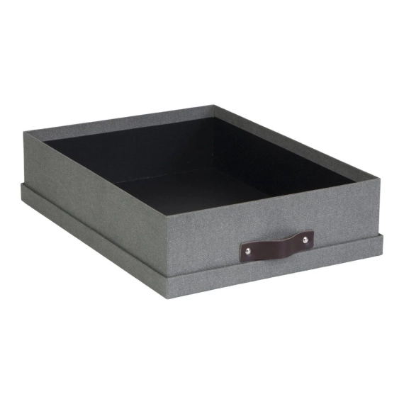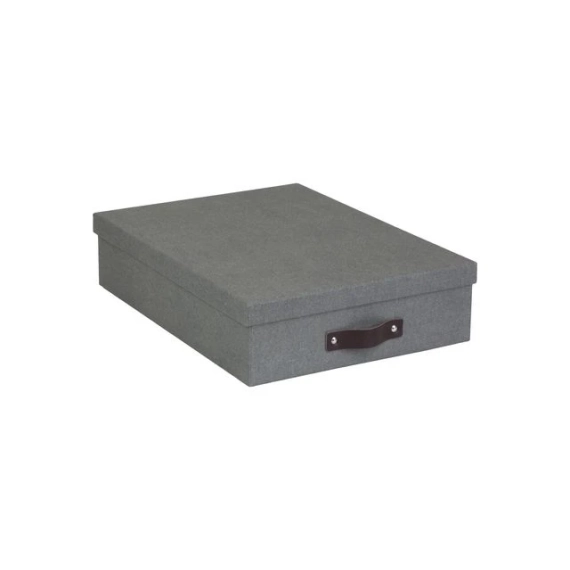 Enkel og stilren oppbevaringsboks for papirer, dokumenter og småsaker. Elegant design med lærhåndtak, og passer i de fleste hjem og kontor. Dens flate format gjør den perfekt å stable oppå hverandre og på den måten holde ulikt innhold separat. - Laget av returpapp kledd med papirlaminat - Mål (BxDxH): 26x35x8,5cm