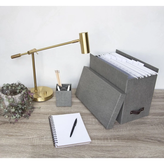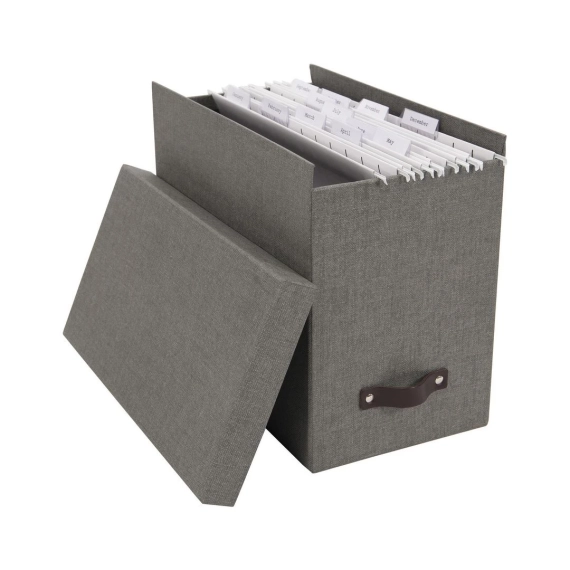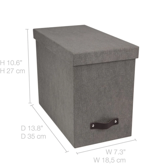 Fin og stilfull oppbevaringsboks med 8 hengemapper. Med lærhåndtak. Elegant design som passer i de fleste hjem og kontor. Hjelper deg å arkivere og sortere dine papirer, regninger, kvitteringer og andre dokumenter i opp til A4 format. - Inkluderer 8 mapper som kan merkes med egen etikett - Sterk konstruksjon som tåler å brukes hver dag - Laget av returpapp og kledd med canvas - Mål (BxDxH): 18,5x35x27cm
