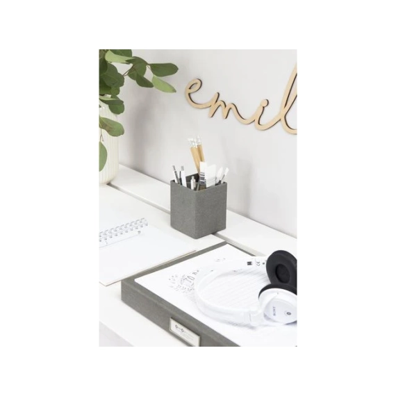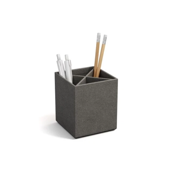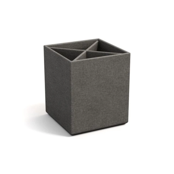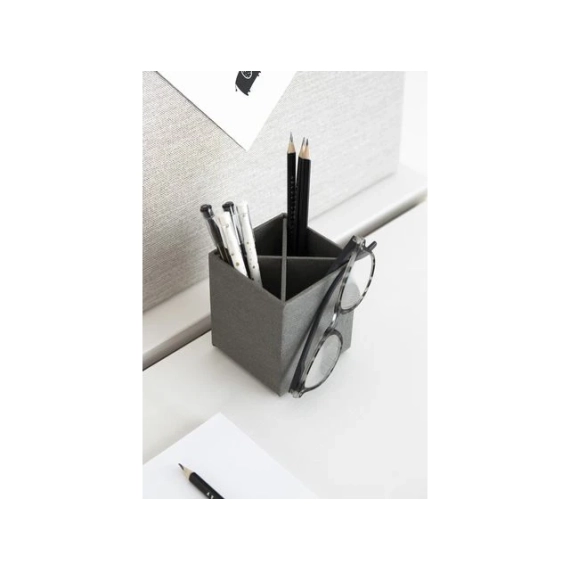 For oppbevaring av penner, blyanter, saks eller make-up-koster. Avtagbar innsats for inndeling av 4 rom. Gummiknotter på undersiden hindrer at holderen sklir, og beskytter samtidig underlaget. - Mål (LxDxH): 8,5x8,5x10 cm - Farge: grå