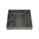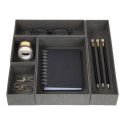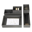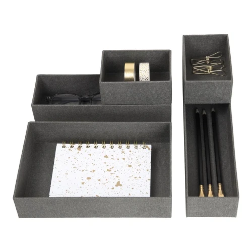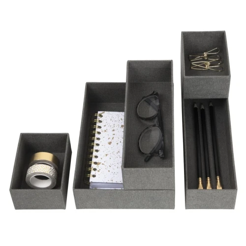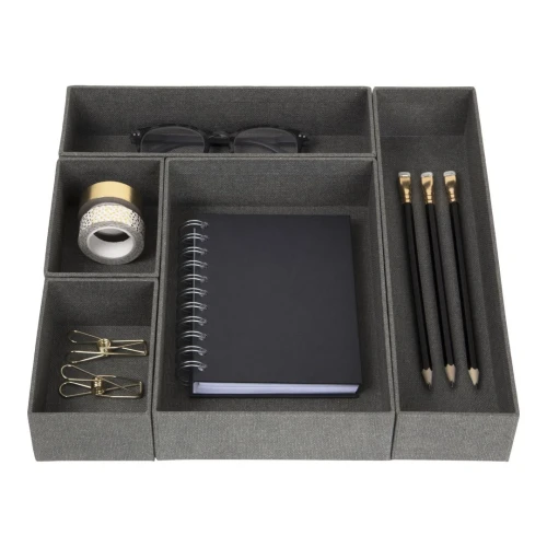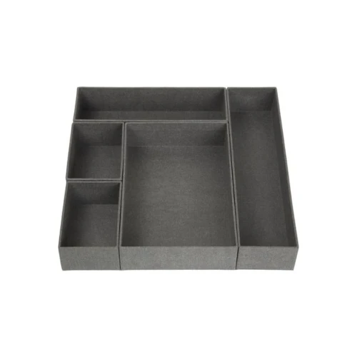 Praktisk oppbevaring for skrivebordets småsaker slik som penner, viskelær, sakser, tape m.m. De 5 løse eskene hjelper deg å sortere småsaker og utnytte plassen maksimalt. Passer like bra i skuffen eller på skrivebordet. - Laget av returpapp og kledd med papirlaminat - Mål (BxDxH): X-Small x2: 7,5x11,5x5cm - Mål (BxDxH): Small: 7,5x22,5x5cm - Mål (BxDxH): Medium: 15x22,5x5cm - Mål (BxDxH): Large: 7,5x30x5cm