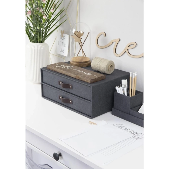 Stilrent og plassbesparende skuffekabinet med 2 skuffer. Smart og veldesignet oppbevaringsløsning for hjem og kontor. Med gummiføtter på undersiden beskytter underlaget og gir økt stabilitet. - Lærhåntaket gir et stilrent uttrykk - Passer flott med ELISA skrivebordsoppbevaring - Laget av returpapp og keldd med canvas - Mål (BxDxH): 33x25,5x14,5cm