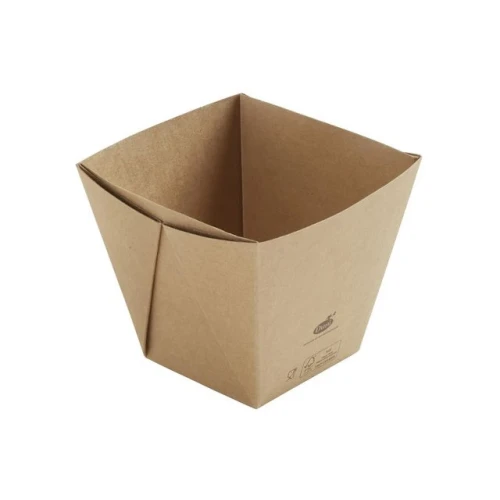 Take Away-boks i brun kartong med PLA-belegg for å forhindre lekkasje. Mål:113X113X100mm. Volum: 820ml. Lokk kan kjøpes separat, varenummer 266937 og 266940.