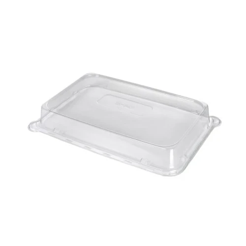Lokk til serveringsfat i bagasse vnr 268155. VARMEBESTANDIGHET Kald bruk, Varmt innhold KULDEBESTANDIGHET Kjøleskap MATERIALKVALITET Recycled PET HOVEDFARGE Transparent