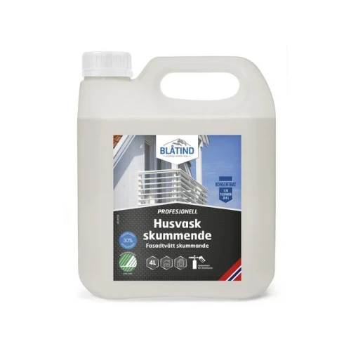 Blåtind Husvask Skummende benyttes til årlig rengjøring av fasader utendørs. Den spesialtilpassede formelen bevarer glansen i malingen samtidig som den er effektiv mot skitt, støv, svertesopp og lignende. Påføring med skumkanon gjør påføringen mer synlig. Dette gir redusert forbruk av vaskemiddel i form av at en unngår rengjøring av samme område flere ganger. Blandeforhold: 1:70. - pH-verdi: 11,5 - Duft: mild - Farge: gulaktig, fargeløs - Fare- og sikkerhetsinformasjon: - H318 Gir alvorlig øyeskade