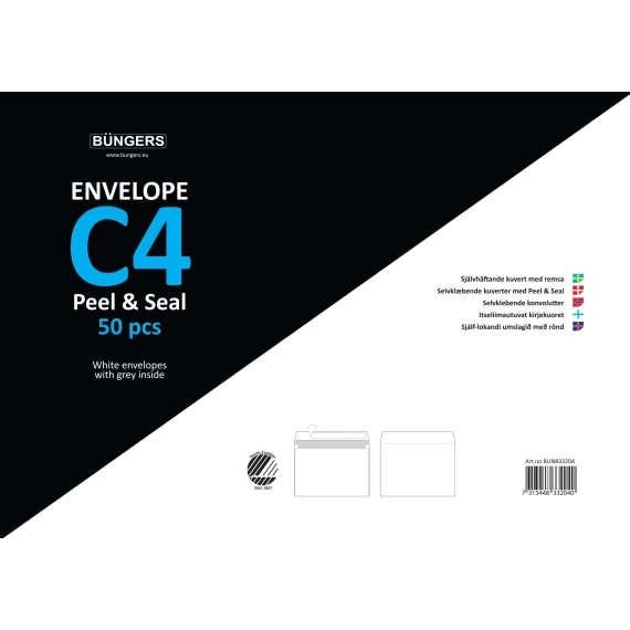 Selvklebende hvite Seal & Peal-konvolutter med heldekkende grått innertrykk. C4. Ny forpakningsdesign med 50 stk i hver pakke.