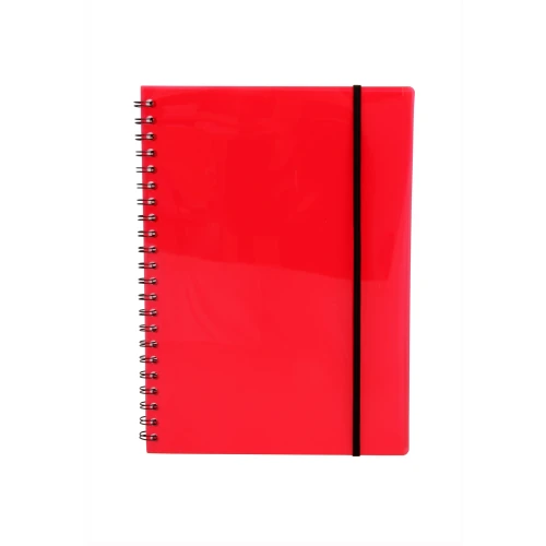 Notatbok i A4 format med strikk i transparent rød polypropylene. Spiral bundet, 70 linjerte ark, 70g papir.