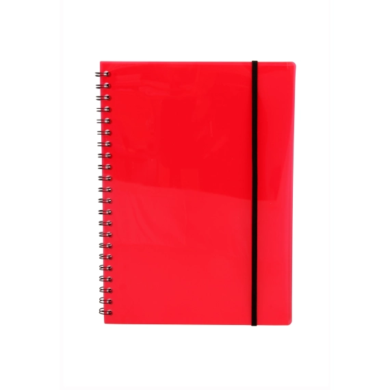 Notatbok i A4 format med strikk i transparent rød polypropylene. Spiral bundet, 70 linjerte ark, 70g papir.