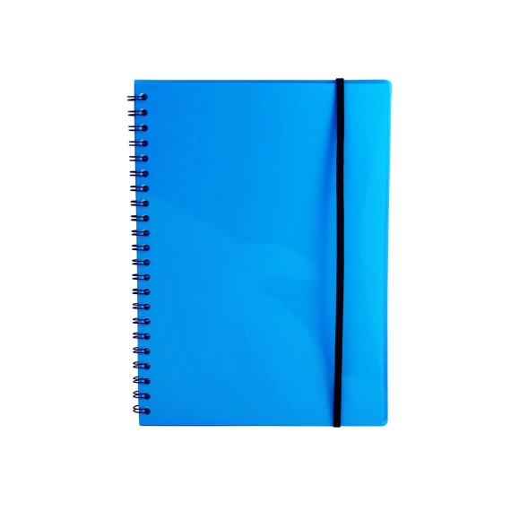Notatbok i A4 format med strikk i transparent blå polypropylene. Spiral bundet, 70 linjerte ark, 70g papir.