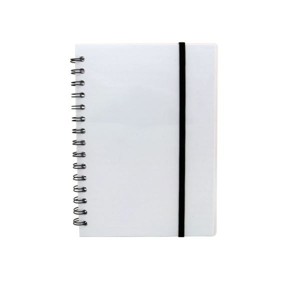 Notatbok i A5 format med strikk i transparent klar polypropylene. Spiral bundet, 70 linjerte ark, 70g papir.