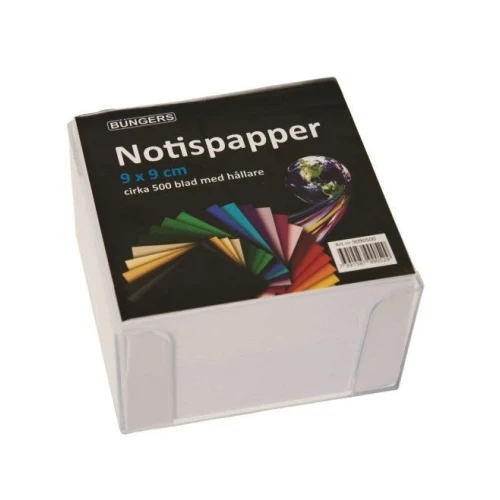 Notisboks med 500 løse hvite ark i plastboks, 9x9cm.