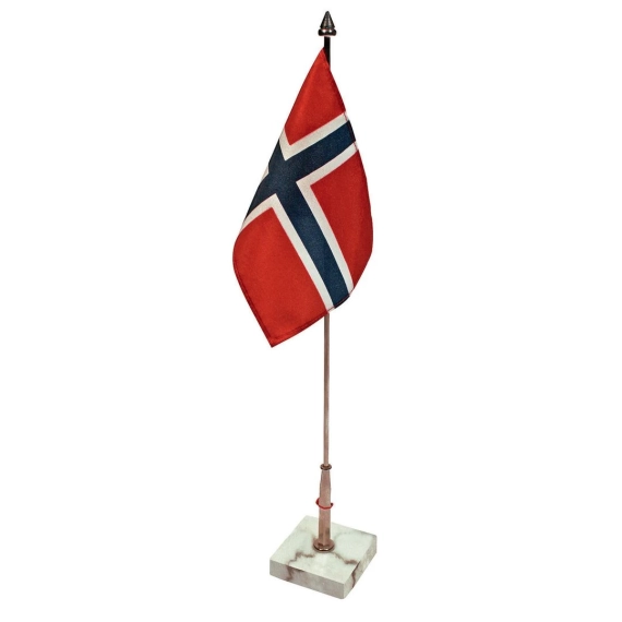 Bordflagg, sølvfarget stang. Bordflagg med sølvfarget stang på marmorfot. Perfekt til 17.mai feiring eller bursdag. - Mål: 40cm - Flagg: 15x10,8cm -