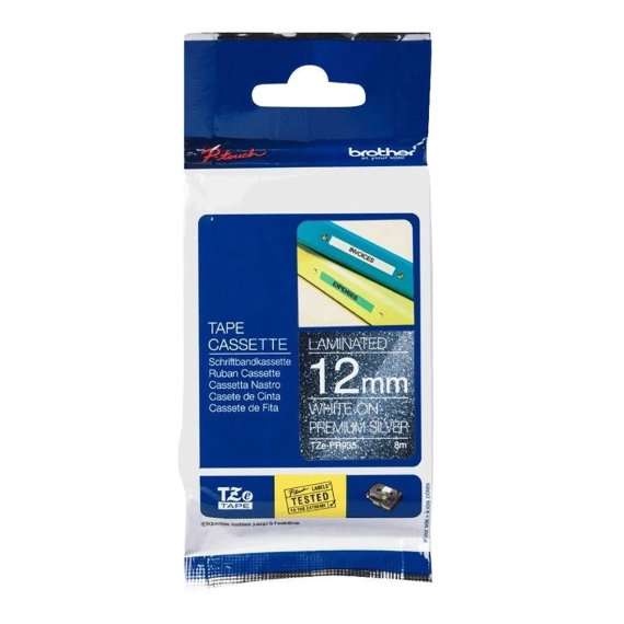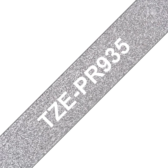 Brother original TZePR935 premium merketape i 12 mm bredde har hvit skrift på en glitrende sølvfarget bakgrunn som gir stilfulle merkelapper.