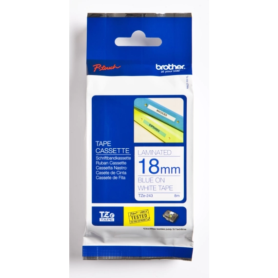 Langvarig kvalitet? Sikre Brother P-Touch Tape Blå på Hvit, 18mm (8m), TZE-243 for klare, holdbare etiketter. Passer til PT-P 950 NW, PT-P 900 W, D 600 VP. Prøv i dag!
