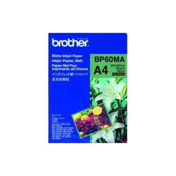 25 ark matt ink-jet papir i A4. Vekt: 145 g/m2. Passer til følgende printere: Alle Brother blekkprintere/-fax.