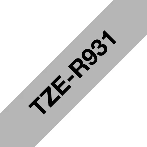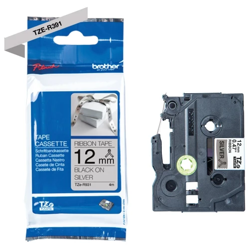 Silkebånd BROTHER TZER931 i sort på sølv i 12 mm bredde som gir deg et raskt og pålitelig resultat, samt en tydelig og profesjonell utskriftsstandard