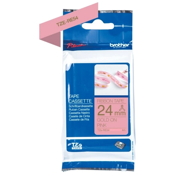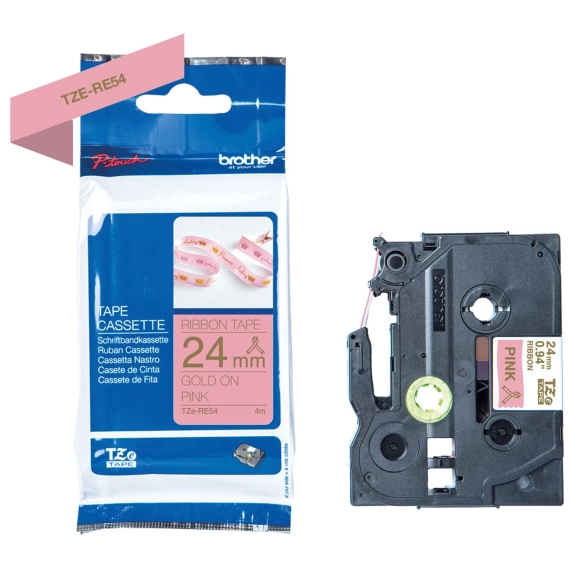 Silkebånd BROTHER TZERE54 i gull på rosa i 24 mm bredde som gir deg et raskt og pålitelig resultat, samt en tydelig og profesjonell utskriftsstandard