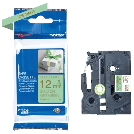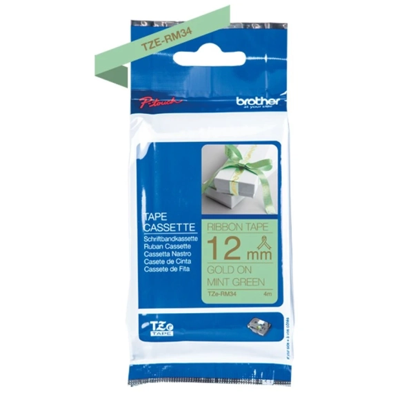 Silkebånd BROTHER TZERM34 i gull på mintgrønt i 12 mm bredde som gir deg et raskt og pålitelig resultat, samt en tydelig og profesjonell utskriftsstandard.