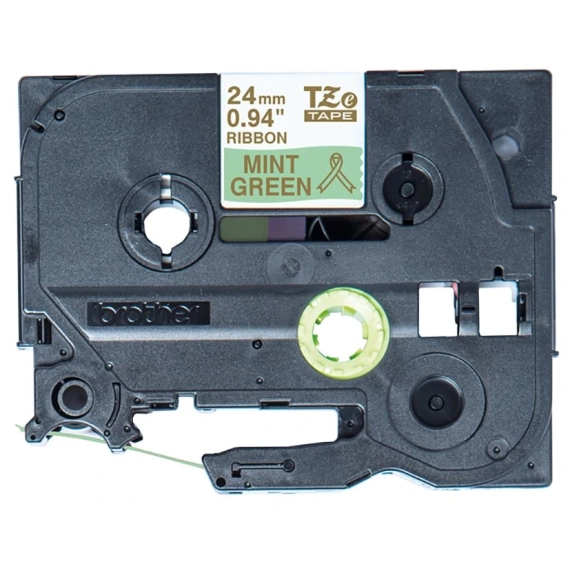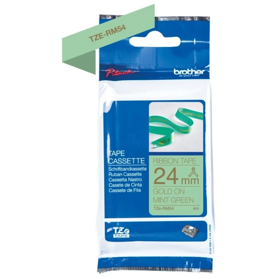 Silkebånd BROTHER TZERM54 i gull på mintgrønt i 24 mm bredde som gir deg et raskt og pålitelig resultat, samt en tydelig og profesjonell utskriftsstandard.