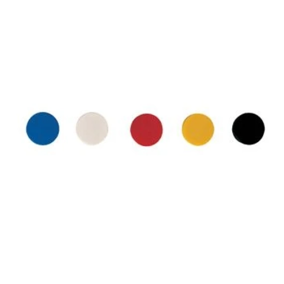 Runde plastknapper med supermagnet. Blisterpakning. Sett med fargene sort, hvit, gul, grønn, blå og rød.