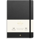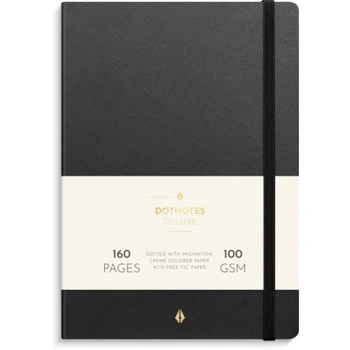 - Eksklusiv notatbok innbundet i mykt kunstskinnomslag - Ark med dots - 100 g kremfarget papir - 80 blad (160 sider) - Lesebånd - oppbevaringslomme bak - Trykket på FSC® godkjent papir - Format: A5, 148 x 210 mm - Farge sort